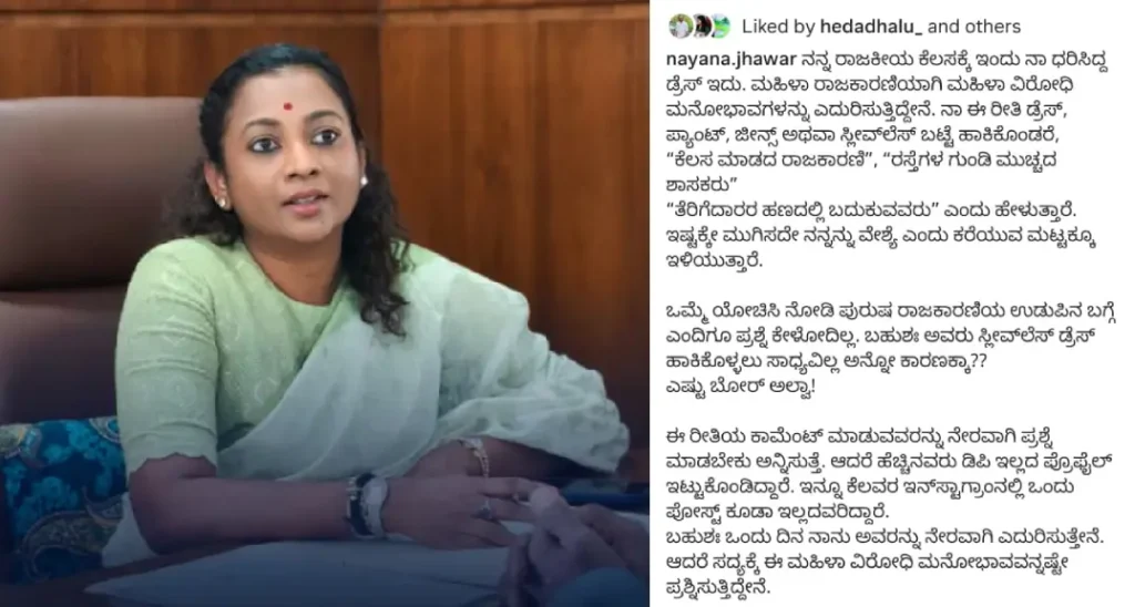 ಮಹಿಳಾ ವಿರೋಧಿ ಮನೋಭಾವವನ್ನು ನಾನು ವಿರೋಧಿಸುತ್ತೇನೆ. ಸ್ಲೀವ್ ಲೆಸ್ ಬಟ್ಟೆ ಹಾಕಿದರೆ ಕೆಲಸ ಮಾಡದ ರಾಜಕಾರಣಿ ಎನ್ನುತ್ತಾರೆ. ಡಿಪಿ ಇಲ್ಲದ ಪ್ರೊಫೈಲ್ಗಳಿಂದ ಅವಮಾನಕಾರಿ ಕಾಮೆಂಟ್ಗಳನ್ನು ಮಾಡುತ್ತಾರೆ. ಬಹುಶಃ ಒಂದು ದಿನ ನಾನವರನ್ನು ಎದುರಿಸುತ್ತೇನೆ ಎಂದು ಅವರು ತಮ್ಮ ಪೋಸ್ಟ್ನಲ್ಲಿ ಬರೆದುಕೊಂಡಿದ್ದರು.